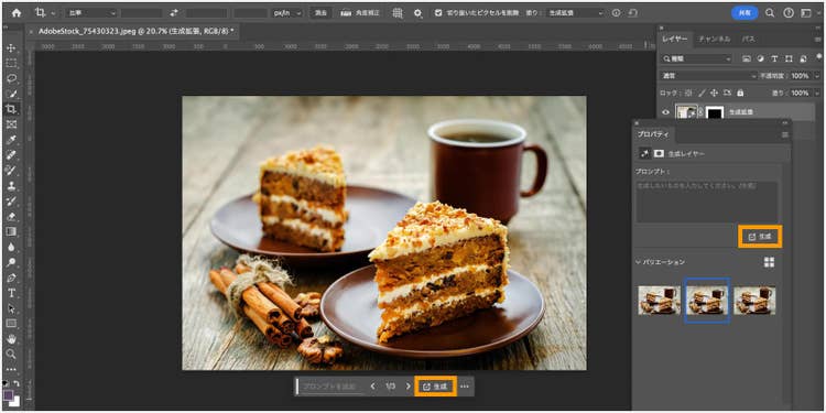 生成されたバリエーションの中に気に入るものがない場合は、コンテキストタスクバーまたはプロパティパネルから「生成」を再度クリックすれば、別のバリエーションを生成できます。