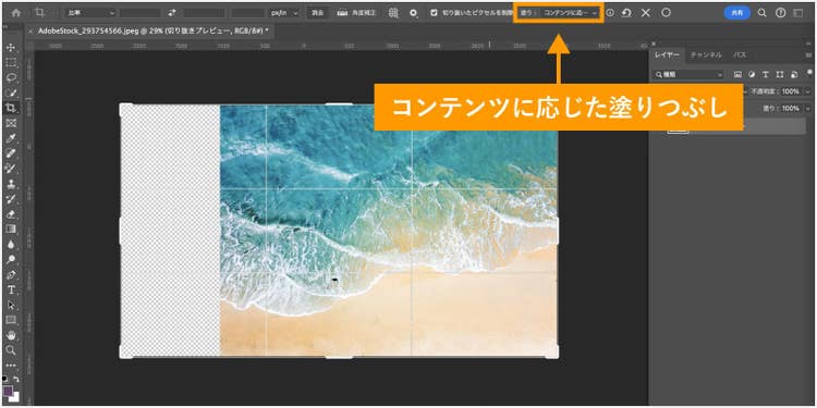 オプションバーから塗りつぶし方式として「コンテンツに応じた塗りつぶし」を選びます。