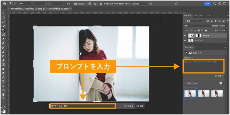 コンテキストタスクバーまたはプロパティパネルに、「棚やテーブル、椅子」と入力して「生成」をクリックします。