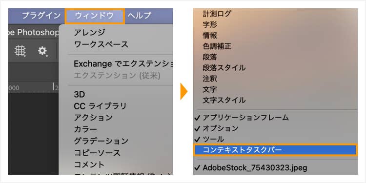 生成拡張では「コンテキストタスクバー」を使うのが便利なので、まずはこちらを表示しておきます。メニューバーの「ウィンドウ」から「コンテキストタスクバー」を選択してください。