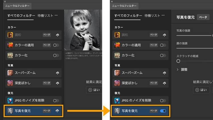 すると、画面右側にニューラルフィルターのメニューが表示されます。