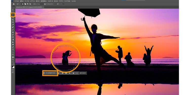 まず、「なげなわツール」で削除したい人物を囲みましょう。囲んだ範囲のすぐ下に現れるコンテキストタスクバーから、「生成塗りつぶし」を選択します。