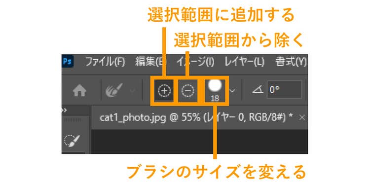 選択範囲を増やしたい場合は、クイック選択ツールを選び、画面左上の「+」アイコンを選択した状態でなぞります。