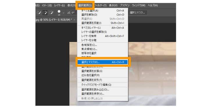 画面上部のメニューから「選択範囲」→「選択とマスク」を選びます。