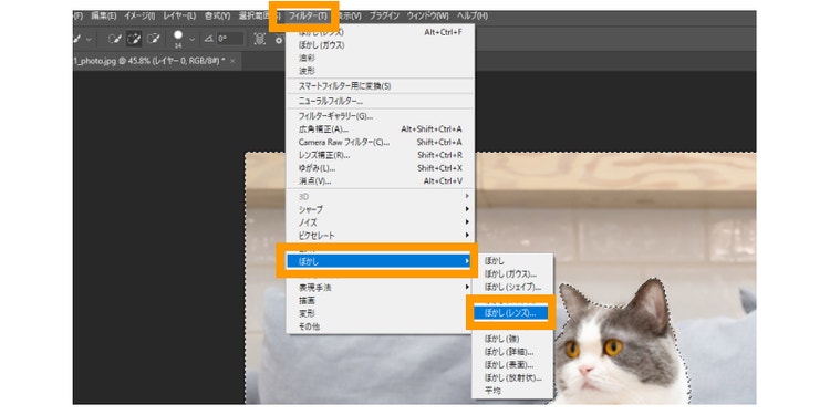 画面上部のメニューから「フィルター」→「ぼかし」→「ぼかし(レンズ)」を選びます。