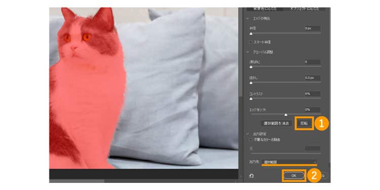 選択範囲を調整したら、画面右下の「反転」をクリックし、被写体以外を選択しましょう。