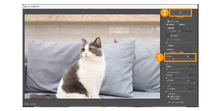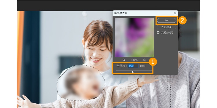ポップアップが表示されるので、「半径」の数値を調整してぼかす度合いを変えましょう。