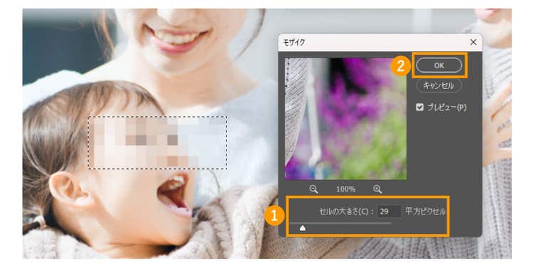 表示されたポップアップで「セルの大きさ」の数値を変えると、モザイクの度合いを調整できます。