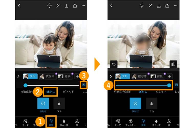 画像の一部分を丸くぼかすには、画面下部の「調整」をタップし、「ぼかし」を選択します。