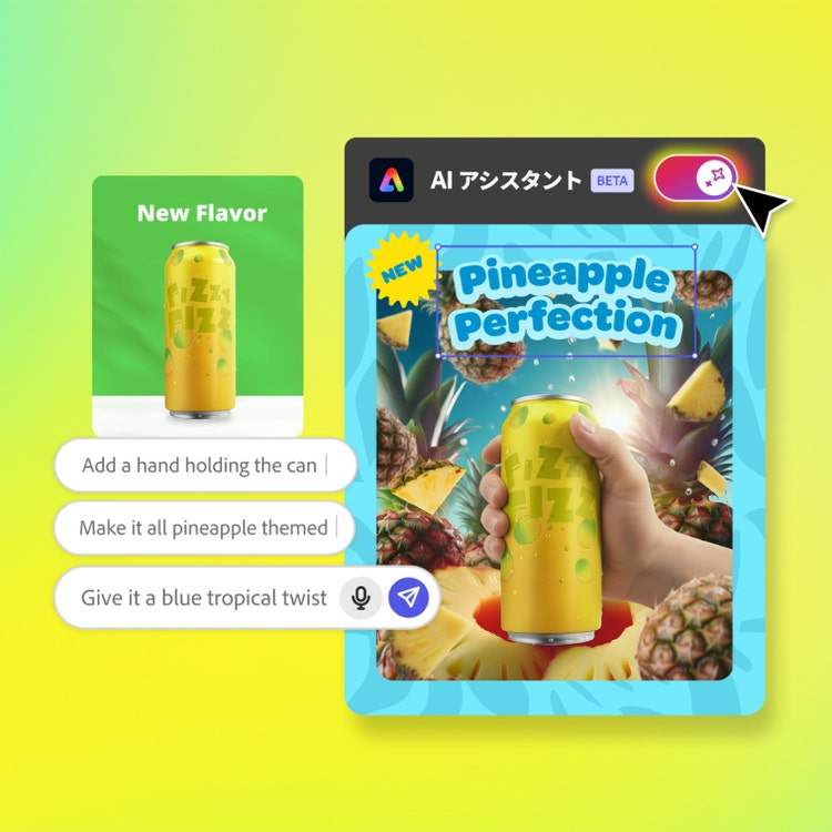 {{adobe-express}}と{{adobe-photoshop}}のAIアシスタント (beta) は、あなたのニーズを先読みし、制作作業を円滑に進めます。もちろん、仕上げるのはあなた自身。AIアシスタントは指示された作業だけを行い、細かい部分は自由に調整できます。