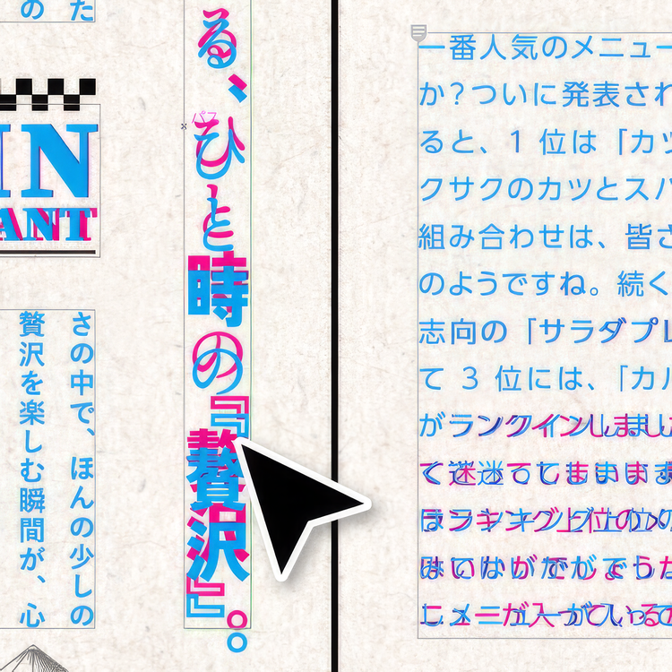 {{illustrator}}や{{indesign}}なら、プロも愛用する豊富な{{adobe-fonts}}を使って、幅広いデザイン表現が可能。さらに、縦書きや文字間隔の微調整など、文字組みに関する便利な機能を搭載。洗練されたレイアウトを効率的に仕上げられます。