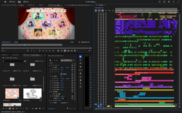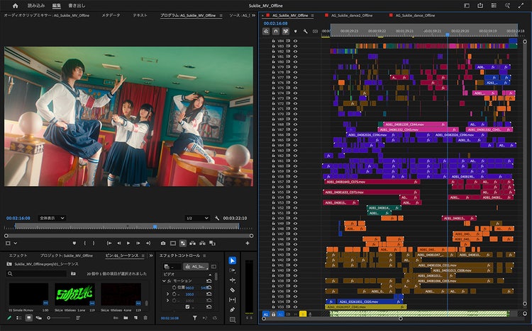 ミュージックビデオは基本的に各シーンをフルで撮影するので、ビンでシーンごとに分け、そこから選んでいく作業になります。かなりの数のカットを撮って、編集では膨大なカットをトラックに積み上げていきます。段積みして音と合わせながら一つひとつセレクトして、選んだカットを私はどんどん上に積んでいくスタイルです。特にアイドルのMVの場合は、メンバーの人数分だけリップ用のシーケンスを作成して、レーザーツールで「いい!」と思った部分を切り出してラベルで色分けしていきます。