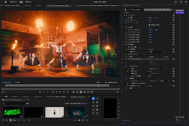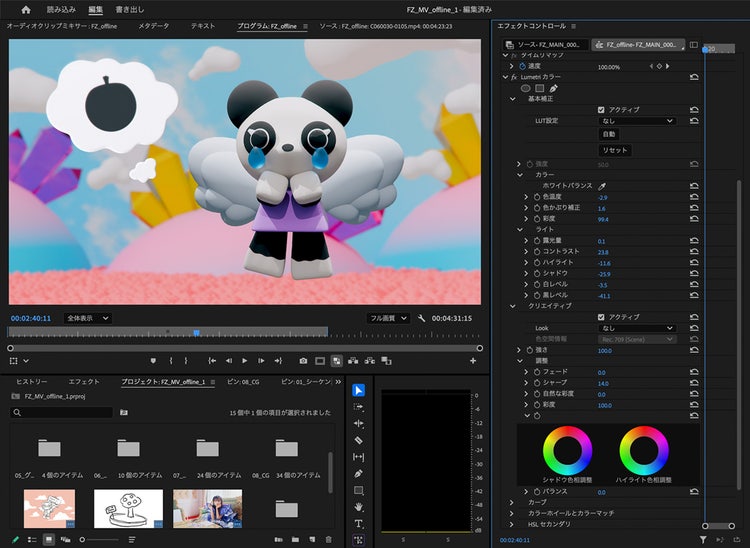 短期間の制作スケジュールの場合私が{{premiere}}や{{after-effects}}のLumetriカラーで調整した映像が、そのまま完パケに反映されることもあります。時間が限られるミュージックビデオ制作では特に重宝している機能です。