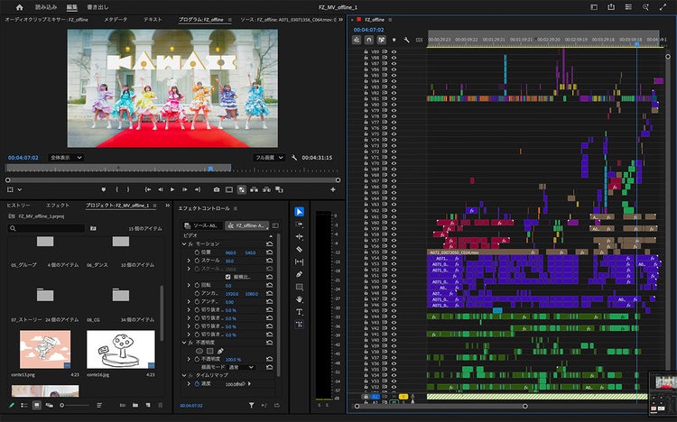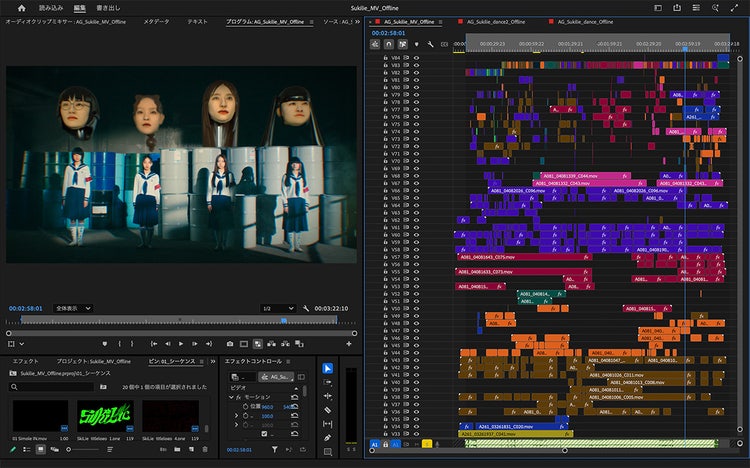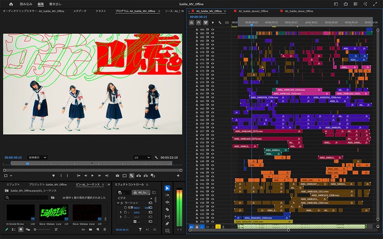 MVの場合はダンスバージョンやリップバージョン、CMの場合は縦型・スクエア・何々編といった具合に数パターンを同時に作ることもあります。本数が増えると大変ですが、{{premiere}}や{{after-effects}}など、アドビ製品に助けられて生きているという感じです(笑)。