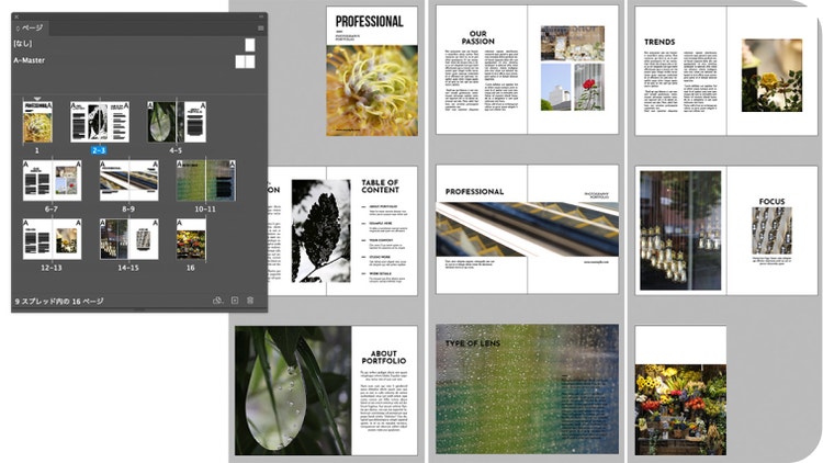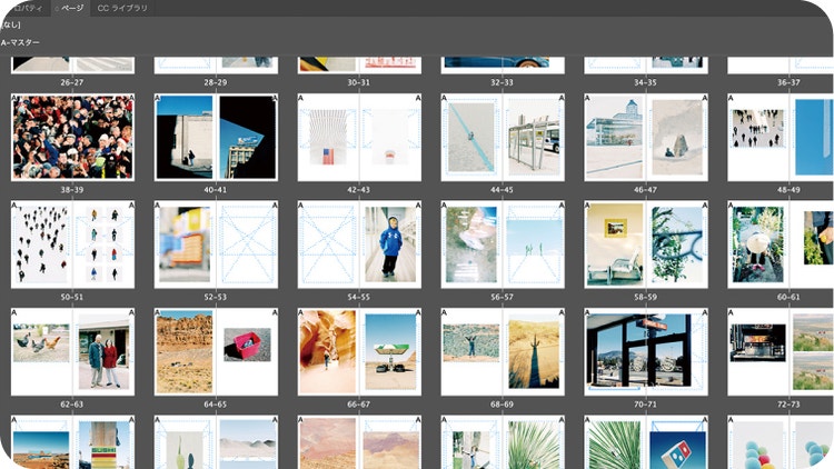 InDesignで「ページ」パネルを大きなサムネール表示にすると、作品集の構成をひと目で確認でき、ページの入れ替えもドラッグ操作でスムーズに行なえます。ページ番号と連動したテキストも扱えるので、手作業でページ番号(ノンブル)を入れる手間もありません。