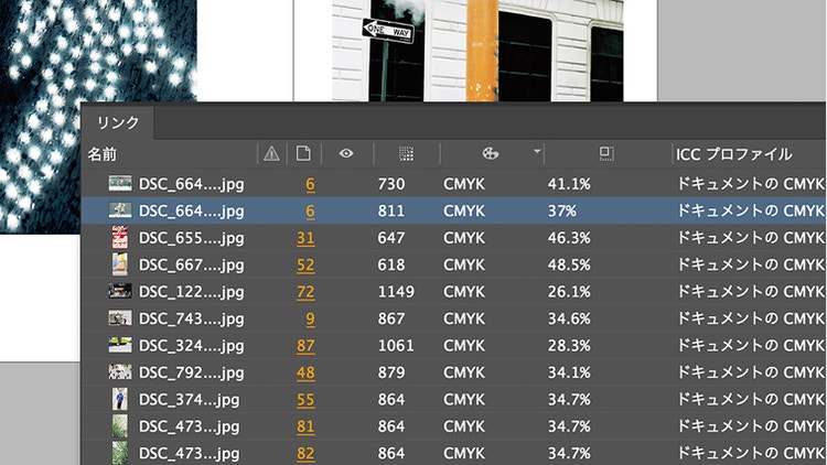 配置画像の管理には欠かせない「リンク」パネル。InDesignでは、配置画像のカラーモード/カラープロファイル/配置後の解像度/拡大・縮小率/リンクファイルが格納されているフォルダ名など、さまざまな情報を一覧表示できるようになっています。