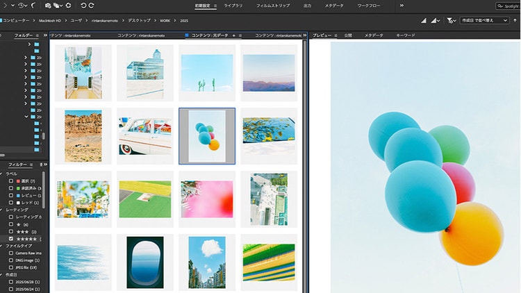 「撮影した写真はまずAdobe Bridgeでチェックして、レーティングを行ないます。選んだ写真は、そのままPhotoshopのCamera Rawプラグインで現像処理をすることもあれば、Lightroomでコレクションとして管理することもありますが、どちらで現像処理をしても設定を共有することができるのはありがたいですね。