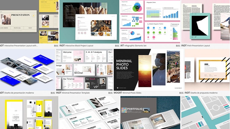 ページ機能をもち、大量の画像を処理できるInDesignは、ポートフォリオやプレゼン資料制作にも最適です。Adobe Stockには、こうした資料づくりに使える無料のInDesignテンプレートがそろっているので、デザインに自信がない方でも大丈夫。自分の作品や情報を、効率よく、見栄えよく、スピーディーにまとめることができます。