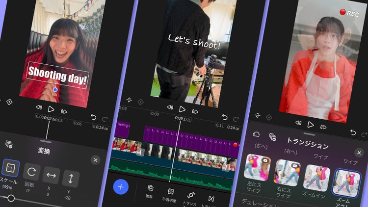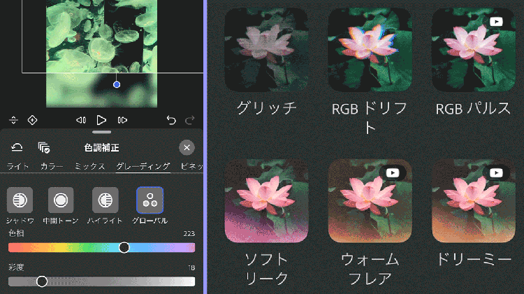 撮影した動画を明るくしたいときや、演出を加えたいときは豊富な「色調補正」「エフェクト」機能を活用してみましょう。タップ&スライド操作で簡単に動画をアレンジすることができます。クリップの切り替わりかたを変える「トランジション」も多数用意されています。