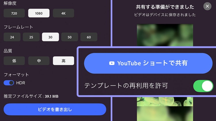 {{premiere}} モバイル版でYouTubeショート用に作成すると、共有時に「テンプレートの再利用を許可」ボタンが表示され、動画の視聴者が同じ構成の動画をつくれるようになります。自信作ができたら、ぜひテンプレートとして公開しましょう。