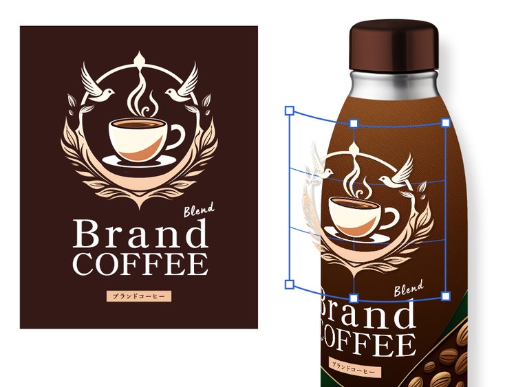生成したイメージにロゴマークを貼り付けます。 Photoshop AIならロゴマークの生成もカンタンです。また、文字を入力したい場合は、Photoshopに含まれている様々なフォントを用いることができます。 ロゴマークを生成するために以下のようなプロンプトを用意しました。「コーヒーと煙と鳥、シンプルモダン、洗練されたロゴデザイン、モノトーンで深みのあるダークブラウン、ミニマル、ベクター、フラット」