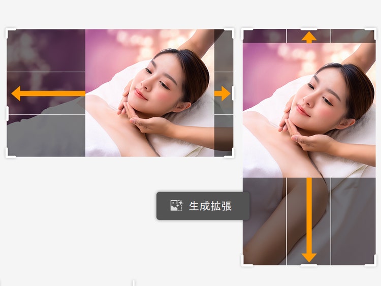 生成したイメージを用いて様々なサイズのバナーを作成します。 「生成拡張」を使用すれば、より大きなサイズのバナーの作成もカンタンです。縦や横に引き延ばしたエリアには自動で画像が追加されます。