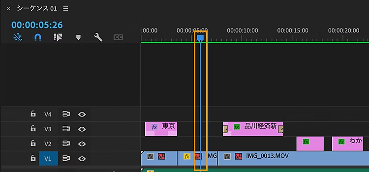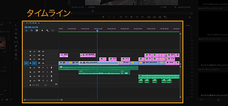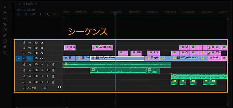 シーケンスと似ていますが、タイムラインは「時間軸に沿って編集作業を行うエリア」、シーケンスは「タイムライン上で編集したデータ」というイメージになります。
