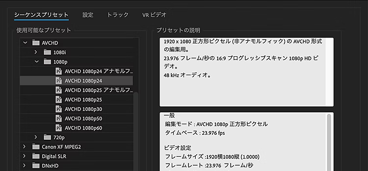 シーケンスを作り始める際に、動画の大きさを定義するフレームサイズや、動画の滑らかさを決めるフレームレートの設定を行います。これらは後から変更も可能です。