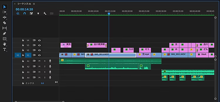 Premiereはシーケンスを複数作ることができ、トラック上に自由に配置できます。例えば1時間のテレビ番組の編集をする場合、1つのシーケンスで1時間分の作業をするのではなく、コーナーごとに分けてシーケンスを作成し、後で1本にまとめると管理がしやすいです。