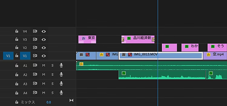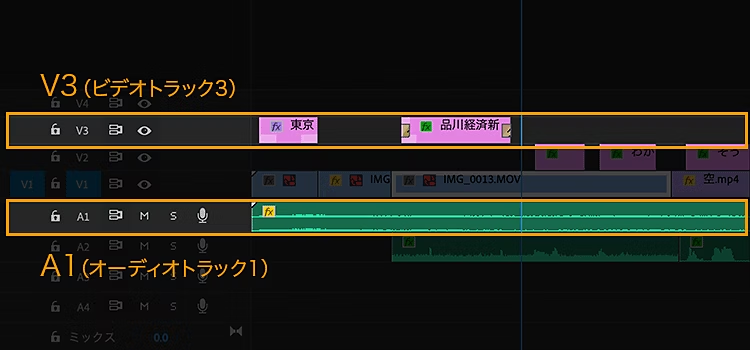 Premiereは、音声用のオーディオトラック(A1、A2……)と、映像用のビデオトラック(V1、V2……)に分かれています。ビデオトラック上の映像を一括で非表示にしたり、オーディオトラック上の音声を一括でミュートにしたり音量を上げたりすることも可能です。