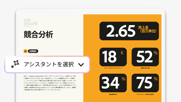 事前定義済みまたはカスタムAIアシスタントを選択し、アイデアの創出、質問への回答の入手、プロジェクトの次のステップの概要作成をすばやくおこなえます。