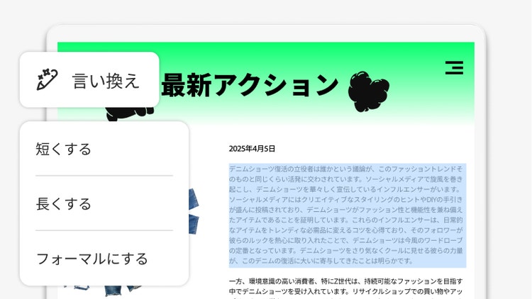 数クリックで文章を書き換え、形式を変更。文書を開いたまま、簡素化、拡張、トーン調整、段落の箇条書き化が可能です。