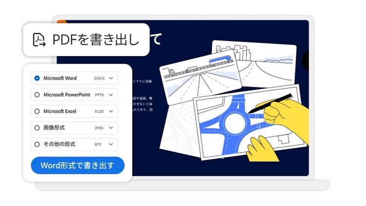 PDFを、Microsoft Word、Excel、PowerPoint、.jpegや.pngなどの画像形式など、別のファイル形式に変換します。