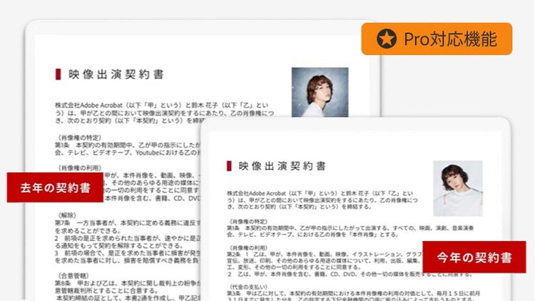 去年と今年の契約書など、2つの文書の間にある違いをすばやく検出できるので文書のチェックがはかどります。違いがある部分はハイライトで表示されます。
