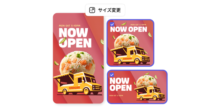 目的に応じてデザインを最適なサイズに変更し、ひとつのファイル内で管理できます。ワンクリックでSNS投稿用にサイズを変更し、投稿を予約してみましょう。