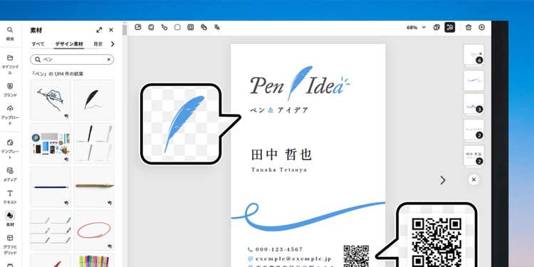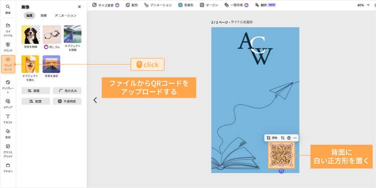 QRコードが生成できたら、編集中のファイルに戻り、名刺の裏面に配置しましょう。「アップロード」で先ほどダウンロードしたQRコードを追加します。