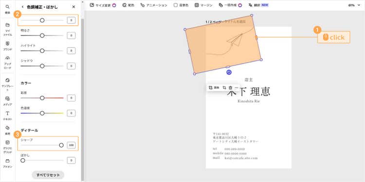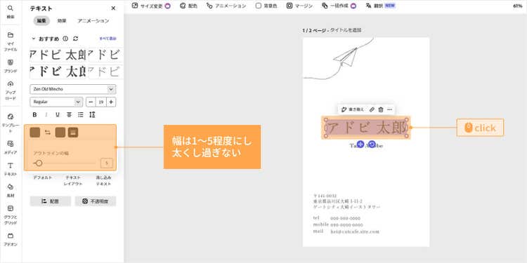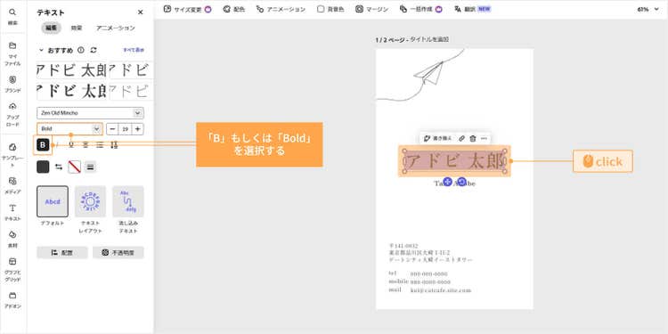また、テキストのフォント、太さや色は「テキスト」のツールバーから調整可能です。名前や会社名などは太字にするとメリハリが出せるので、強調したいときにオススメです。