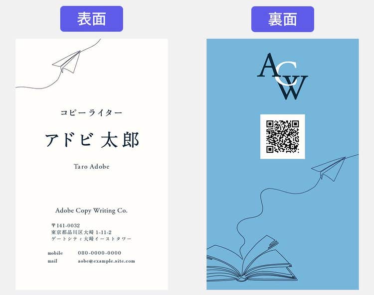 表面はテキスト情報が多めなので視認性が高い白系に、裏面は色付きにするとコントラストのあるおしゃれな仕上がりになります。