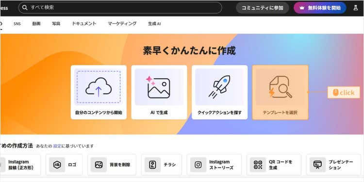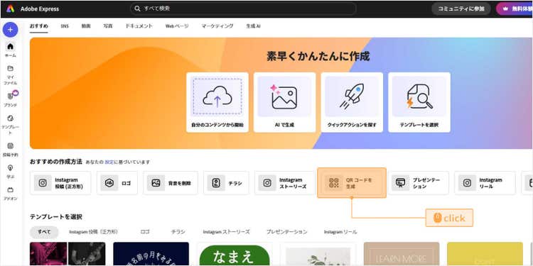はじめにGoogleアカウントやFacebookなどのSNSアカウント、メールアドレスで無料のアカウントを作成し、Adobe Expressにログインしてください。