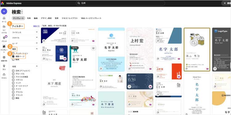 今回は裏表印刷の名刺を作りたいので、「フィルター」>「種類」>「複数ページ」にチェックを入れて、裏表デザインのあるテンプレートを選びます。