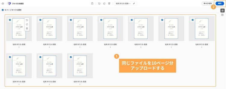 2.Adobe Acrobatの「PDFを結合」にダウンロードした表面のファイルを10個アップロードし、結合します。結合できたらPDF形式でダウンロードしてください。