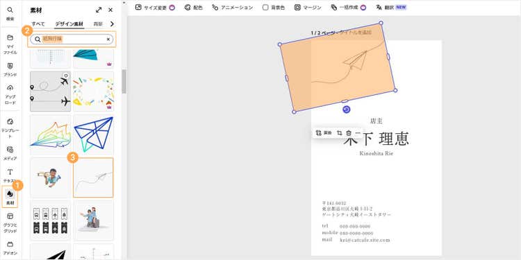 次に、「素材」からイメージに合った素材を検索します。検索窓に追加したい素材のキーワードを入力し、「デザイン素材」「図形」「アイコン」それぞれの中から好みの素材を選びましょう。自身の表現したいイメージに沿った素材を追加することで、デザインに自分らしさや個性を加えられます。
