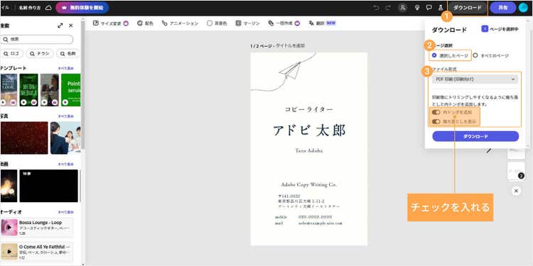 1.Adobe Expressで作成したデータを「選択したページ」にチェックを入れ、「PDF印刷(印刷向け)」で「内トンボ」「裁ち落としを表示」でダウンロードします。表面、裏面、を別個のPDFにしてください。