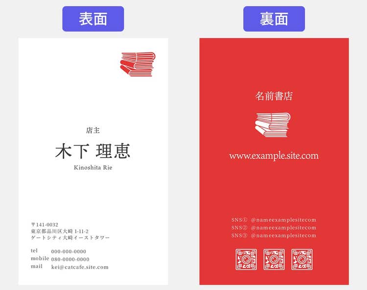 また、情報を整理する方法として、名刺やショップカードを両面印刷にするのもオススメです。両面に情報を分けることで、1面あたりの情報量が抑えられ、すっきりとしたデザインに仕上がります。さらに、名刺の表面と裏面で同じモチーフを使ったり、紙面の色を反転させたりすることで、全体の印象をさらに強くできるでしょう。
