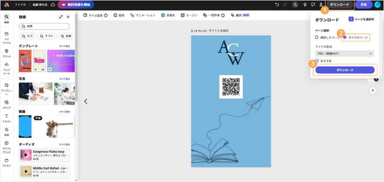 デザインが完成したら、「ダウンロード」>「ページ選択」>「すべてのページ」を選び、ダウンロードしてください。