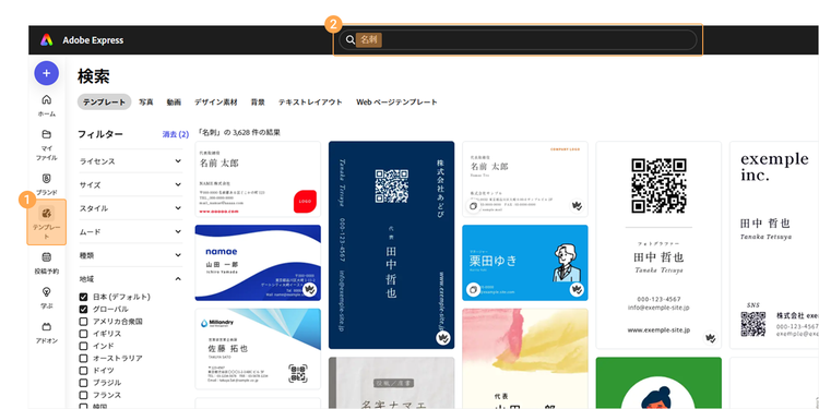 Adobe Expressの「名刺」のテンプレート検索結果