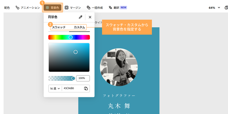 「スウォッチ」からオススメの色を選べるほか、「カスタム」からはカラーピッカーや色コードでより詳細に色を指定できます。