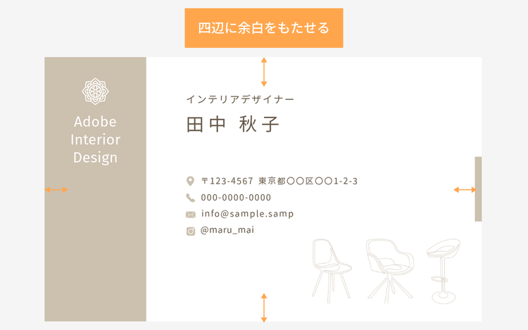 特に文字が四辺に寄りすぎると、窮屈な印象になるだけでなく、名刺を渡す際に指先で情報が隠れてしまったり、印刷の際に見切れてしまったりするリスクがあります。