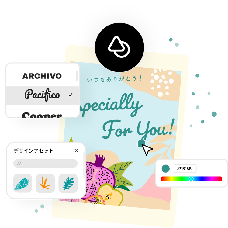 デザインの経験がなくても、わずか数分で豪華なカードデザインを作ることができます。各種場面にも対応できる数千ものカードテンプレートから、好きなものを選んでカスタマイズしましょう。画像やデザインアセットライブラリを検索して、選択した要素をデザインに直接ドロップすれば、カードをより魅力的にすることができます。数千ものライセンスされたAdobe Fontを使用して、カードデザインのメッセージ性を高めることができます。