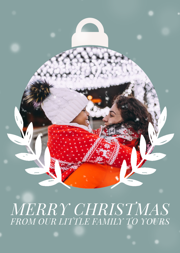 写真をアップロードし、カラーテーマを変更してクリスマスカードをパーソナライズします。テキストボックスをクリックして入力し、オリジナルメッセージを追加しましょう。Adobe Expressのフルエディターを使えば、グラフィック、アニメーション、枠線などを使ってさらにカスタマイズできます。